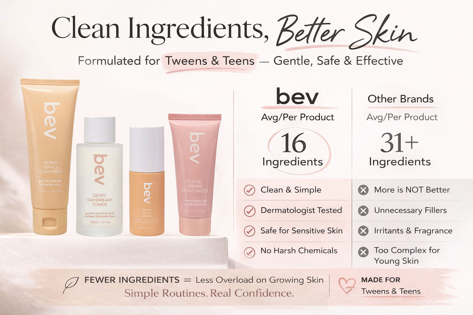 Bev started with a feeling every parent and teen knows well — wanting something safe, trustworthy, and made just for you, but not being able to find it. Our family searched for skincare gentle enough for teen skin yet still beautiful, effective, and exciting to use… and nothing existed. Adult products were too harsh. Kid products fell short. So Everleigh embarked on finding the solution herself. Bev is the bridge — clean, EU-standard formulas that protect developing skin while delivering results loved by all ages.